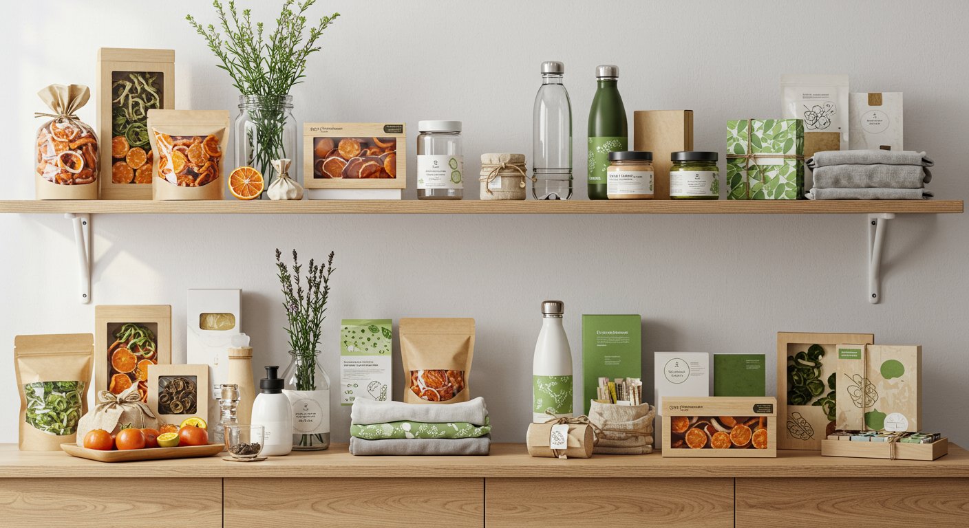 環境に配慮したギフト商品が並ぶディスプレイ
